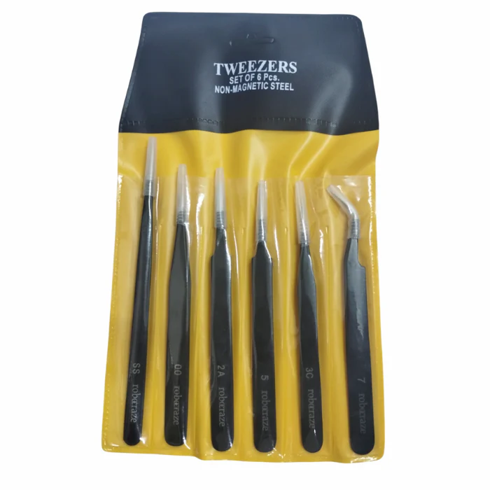 Engineered with high-quality stainless steel and coated with a durable epoxy finish, each tweezer in this set offers robust performance and smooth handling. The anti-static, anti-corrosive, and anti-magnetic properties make it perfectly suited for sensitive electronic components, SMD soldering, inspection tasks, and other fine applications. With six different tip styles—including pointed, curved, bent, and flat—this set covers a wide range of tasks where accuracy and control are crucial.